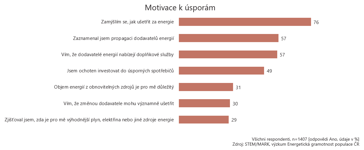 Jen 15 % Čechů si umí porovnat cenu energií, které odebírá, a pouze necelá třetina lidí vnímá proces změny dodavatele energií jako příležitost pro finanční úsporu. Nízká energetická gramotnost limituje i schopnost snižovat náklady – např. prostřednictvím snižování spotřeby energie či nákupem úsporných spotřebičů. Vyplývá to ze studie Energetická gramotnost populace ČR, kterou zpracovala agentura STEM/MARK za podpory Ministerstva průmyslu a obchodu.