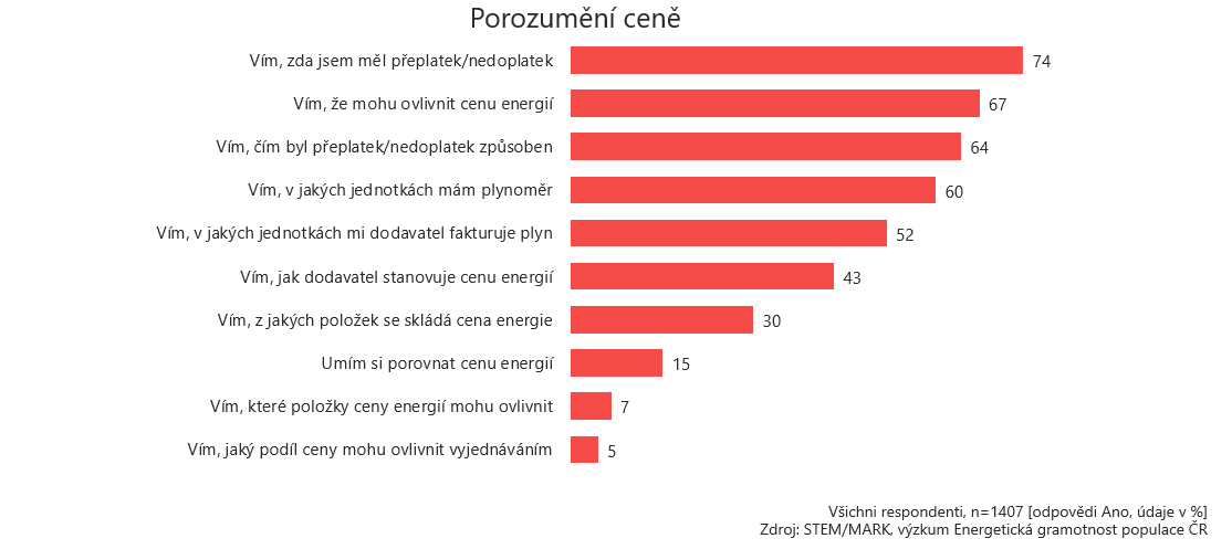 Velkou neznámou představuje pro Čechy hlavně skladba ceny za odebíranou energii. Podle průzkumu energetické gramotnosti si 2/3 lidí nezjišťovaly výhodnost a ceny jednotlivých druhů energie pro jejich konkrétní podmínky. Třetina lidí pak dokonce neví ani to, že svou cenu energie může ovlivnit. To mohou být jedny z hlavních důvodů, proč se někteří spotřebitelé do změny dodavatele příliš nehrnou.