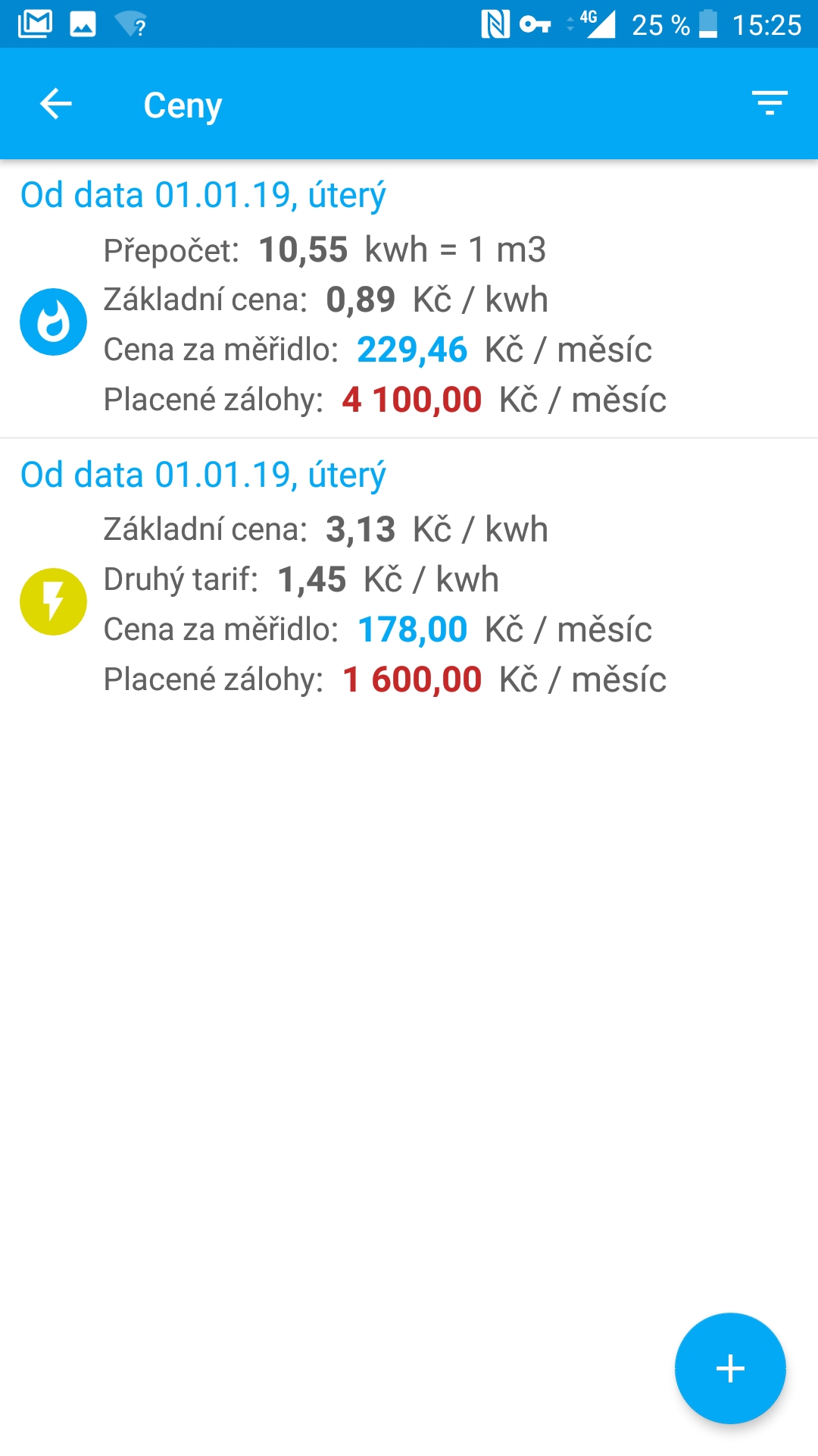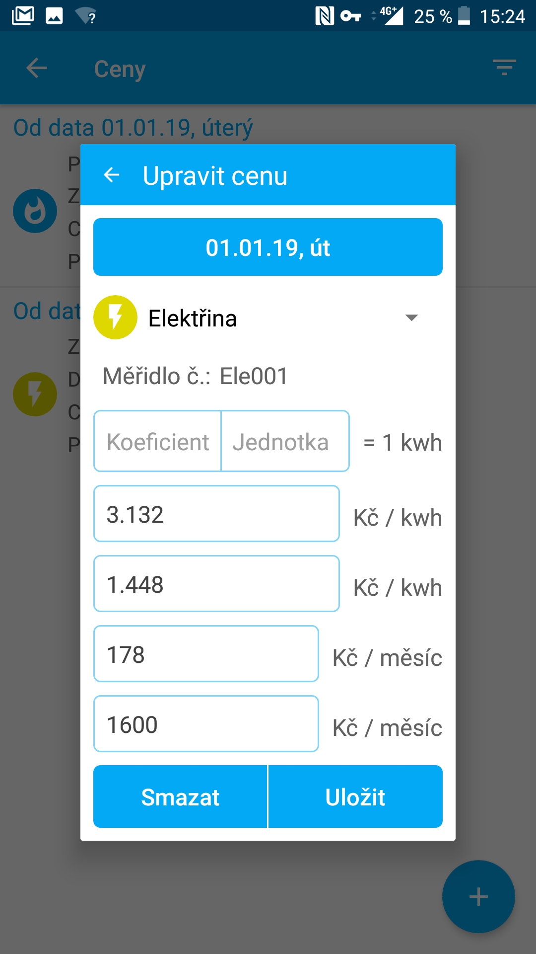 Ceny můžete zadávat s datem platnosti. To se hodí, protože cena za energie se mění, pokud vám tedy dodavatel oznámí změnu ceny, zadáte si ji s datem platnosti do aplikace a nejlépe v den platnosti odečtete stavy. Aplikace už sama přepočítá zbytek.